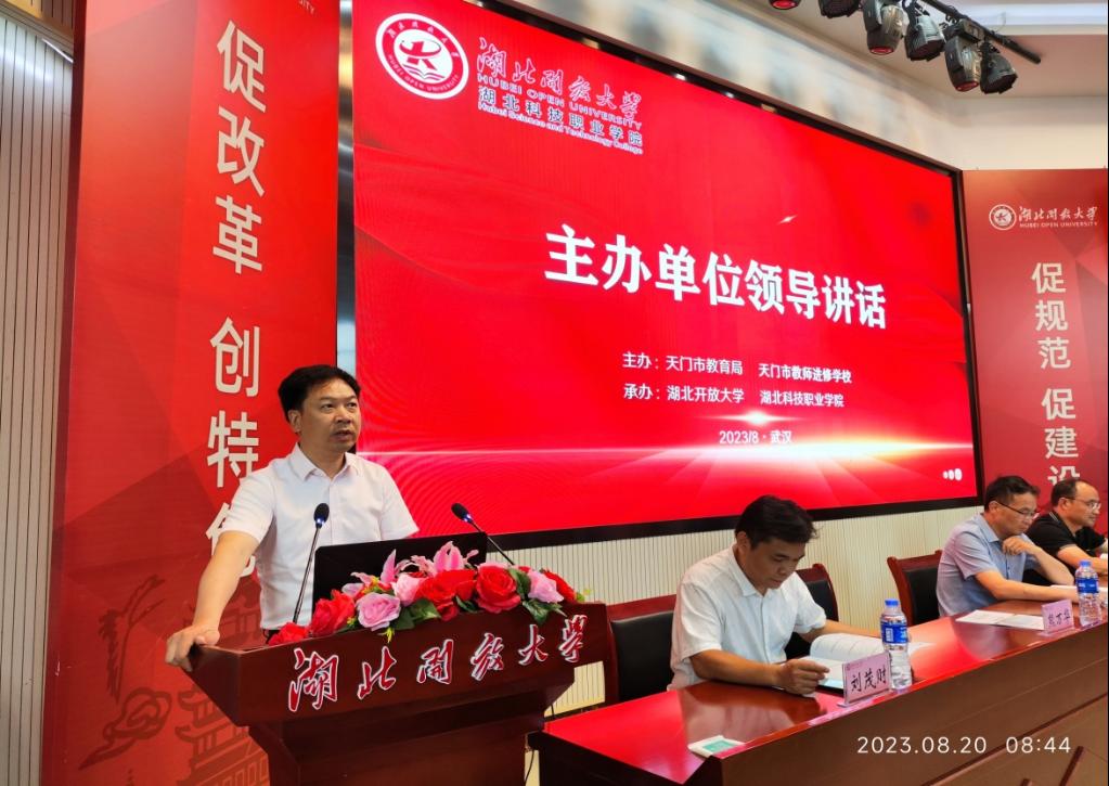 本网讯(通讯员 沈雁君/文 沈雁君 刘楚凡/图)8月20日上午,由天门市教育局、天门市教师进修学校主办,湖北开放大学承办的“国培计划(2023)”——天门市小学英语骨干教师培训班在湖北开放大学举行开班仪式。来自天门市的六十名参训学员齐聚报告厅,天门市教师进修学校副校长鲁天琼、工会主席熊万华,武汉东湖高新区教育发展研究院主任舒晓辉出席开班仪式。本次培训开班仪式由湖北开放大学开放教育学院、培训学院副院长刘茂财主持。