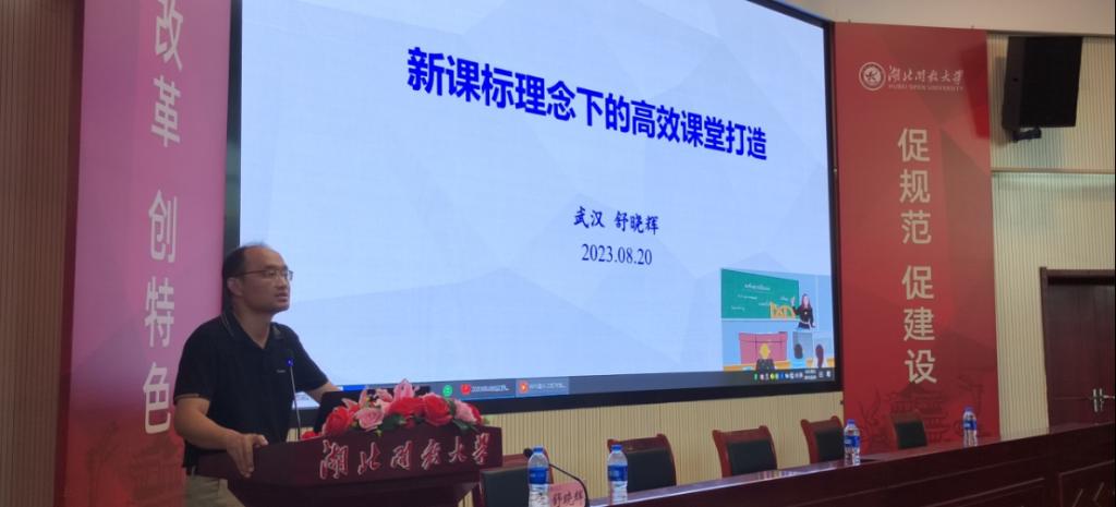 开班仪式结束后,武汉东湖高新区教育发展研究院主任、正高级教师、湖北省英语特级教师舒晓辉以《新课标理念下的高效课堂打造》为题,做了精彩的开班授课。他从新课标的主要内容、高校课堂的内涵、典型的课例分析三大模块入手,详细解读了义务教育课程标准,讲授如何打造高效课堂,并对多个小学英语典例进行了分析。参训学员课后纷纷表示受益匪浅。