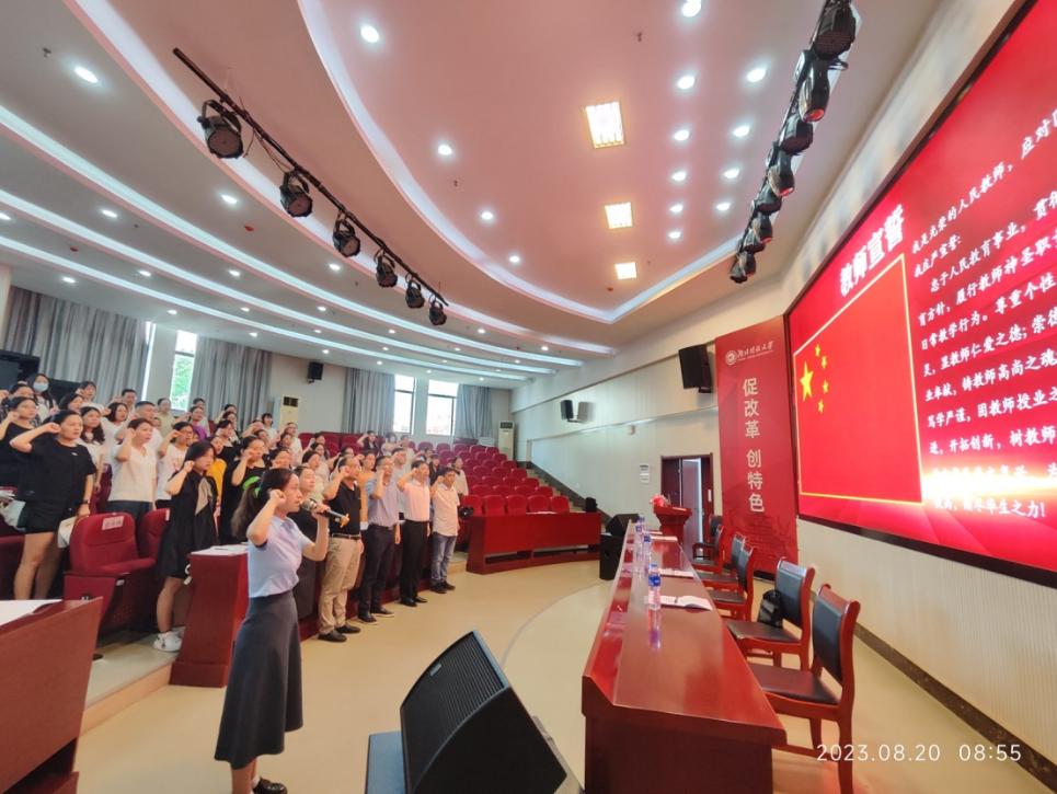 开班仪式最后,与会领导和全体参训的骨干教师面对国旗庄严宣誓,全场齐声诵读教师誓词。