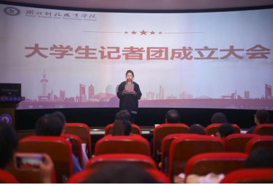 谢萍为成立大会致辞,宣布大学生记者团正式成立,并宣读大学生记者团组织架构。