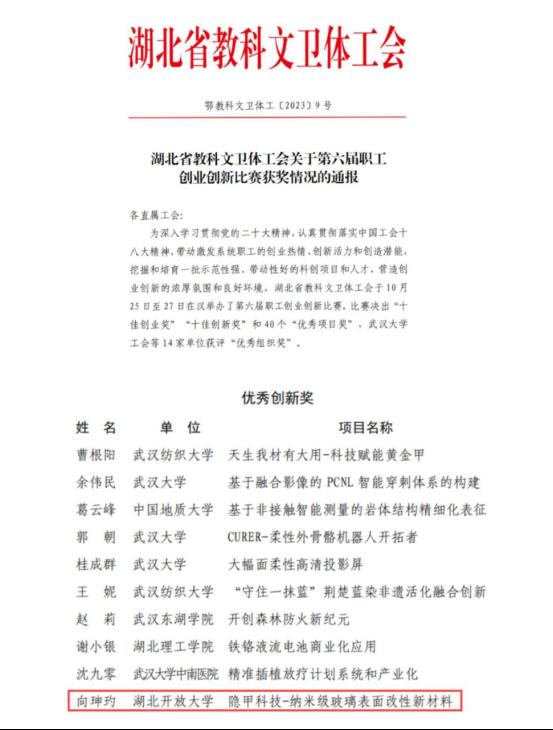 本网讯(通讯员 王斌新 文/图)11月9日,湖北省教科文卫体工会公布第六届职工创业创新比赛获奖情况,我校电信工程学院向珅玓和机电工程学院王家旻团队的《隐甲科技—纳米级玻璃表面改性新材料》项目喜获“优秀创新奖”。