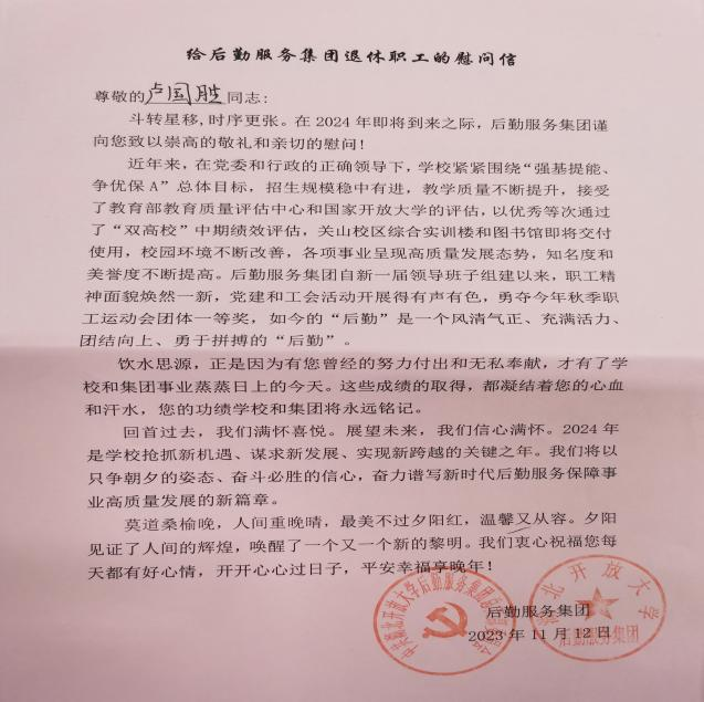集团高度重视退休职工“回娘家”活动,经过充分酝酿沟通,根据集团实际情况制订了切实可行的实施方案,并通过了集团党总支委员会和分工会委员会会议审定。集团印制了《给退休职工的慰问信》,并送到每一位退休职工手上,表达学校和集团对退休职工的关心与爱护。