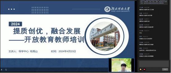 本网讯(通讯员 王婷/文 高杨舒/图)为落实好评估整改师资队伍建设有关工作要求,进一步提升体系教师的教学规范意识,在教师队伍中切实树牢开放教育教学过程管理规范意识,4月23日下午,学校组织开展2024年开放教育教师资格认定首场岗前培训暨湖北开放大学2024年开放教育教学规范培训。本次培训采用直播形式进行,特别邀请导学中心主任桂高山授课。各市(州)、省直管市广播电视大学及直属分校(学院)认真组织,体系教师积极参与、踊跃发言。