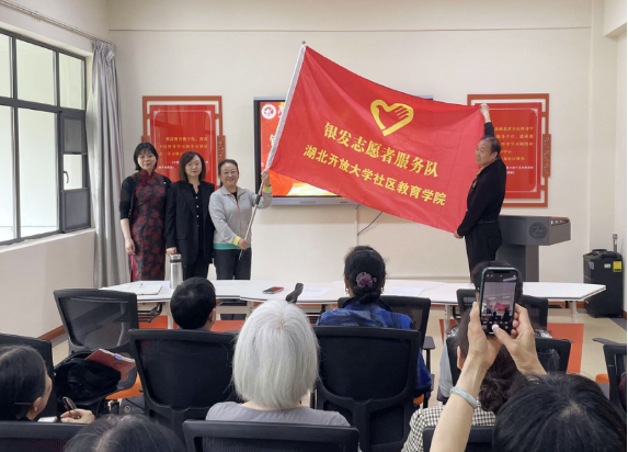 成立仪式上,宣读了银发团队成员名单,社区教育学院领导参与了揭牌及授旗。