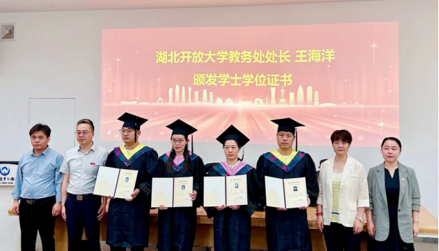 会上宣读了《国家开放大学关于授予本科毕业生学士学位的决定》《开放教育学院2023年秋季学期优秀学员的表彰决定》。王海洋为获取学士学位的学生代表颁发了学士学位证书,桂高山为优秀学员颁发了奖品与证书。