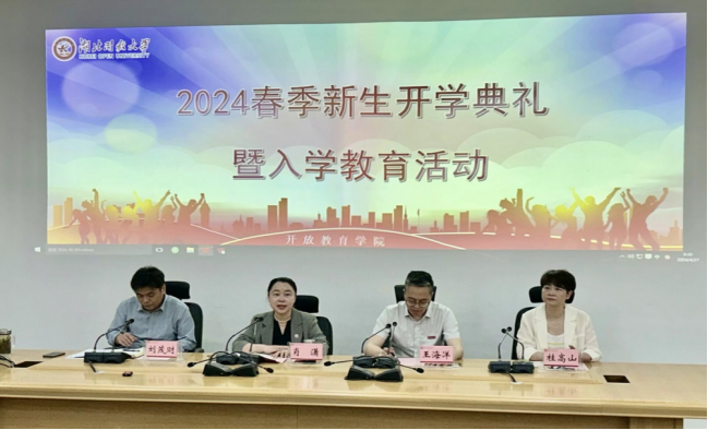 本网讯(通讯员 肖娟/文 沈雁君/图)4月27日上午,开放教育学院通过线上线下同步的方式,举行了2024年春季学期新生开学典礼暨入学教育活动。学院全体教职工和80名新生代表现场参加了活动,近1600名新生线上参会。开学典礼由院长肖潇主持。教务处处长王海洋、导学中心主任桂高山出席活动。