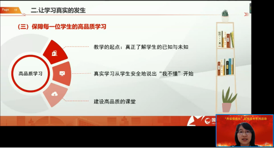 分享会上,梅林从书籍介绍、作者介绍、分享理由、精华解读、总结感悟等方面做了交流分享,重点介绍了从浅表学习到深度学习的课堂变革、如何让学习真实地发生、指向深度学习的高品质学习设计、成为自我革新的领航者专家型教师四个方面的内容。梅林认为应该“全情投入地去观察学生,用心去体会和感知学生的所思所想、困惑迷茫”,不断反思改进自己的教学,创造性地满足学生的学习需求,让每一个学生都有机会实现自我突破,成为卓越而快乐的终身学习者。随后,欧阳嘉煜总结点评并分享了自己的感悟。