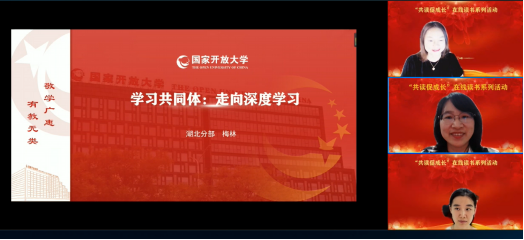 本网讯(通讯员 程雪丹 文/图)为扎实推进数字大学内涵建设,培养终身学习的践行者、示范者、引领者,建设高素质专业化新型教师队伍,国家开放大学面向办学体系开展“共读促成长”在线读书系列活动。我校教师梅林受邀担任第九场活动的分享嘉宾,于5月9日晚以书籍《学习共同体:走向深度学习》为主题作阅读分享,与国家开放大学办学体系教师交流读书心得、共享学习成果。活动由国家开放大学黑龙江分部邓红红副教授主持,北京理工大学教育学院助理教授、硕士生导师欧阳嘉煜担任对谈嘉宾。