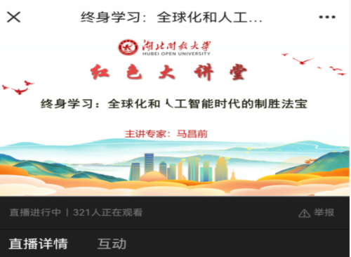 本网讯(通讯员 谢欣 文/图)6月3日下午,湖北开放大学红色大讲堂在思政课体验式学习中心和线上教学平台同步开讲,教育部课程思政教学名师、中国地质大学博士生导师马昌前教授受邀作题为“终身学习:全球化和人工智能时代的制胜法宝”的专题讲座。湖北开放大学体系师生500余人聆听了本次讲座,活动由马克思主义学院负责人胡继慧主持。