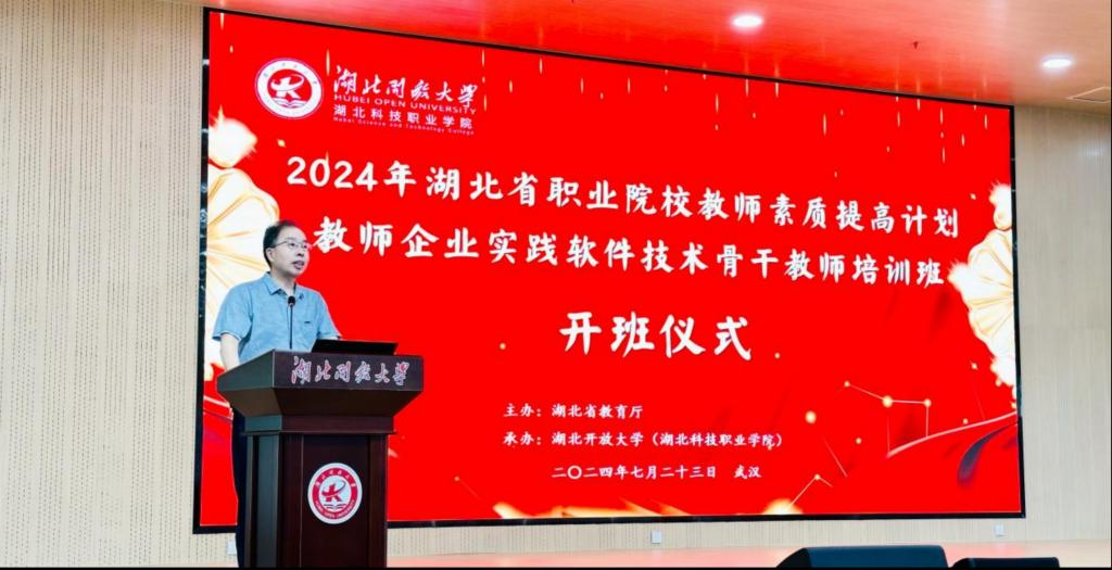 开班仪式上汤春来对各兄弟院校的参训教师表示热烈欢迎,并介绍了学校近年来快速发展取得的成果、湖北开放大学和湖北科技职业学院两校融合的办学特色。汤春来表示,学校对承办本次培训高度重视,学校各部门要紧密协作,为本次培训工作做好技术服务和后勤保障,并祝愿全体学员学有所获、学有所成。