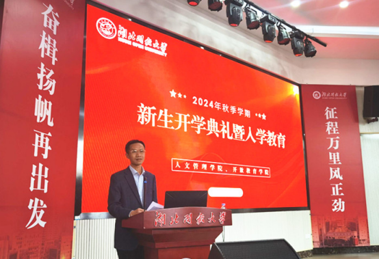 本网讯(通讯员 肖娟/文 徐辅中/图)10月27日,人文管理学院、开放教育学院2024秋季学期新生开学典礼暨入学教育活动在鲁巷校区学术报告厅举行。副校长夏学文出席活动,学院全体教职工及新生代表150余人参加现场活动,近1200名新生线上参会。典礼由人文管理学院、开放教育学院院长饶雨泰主持。