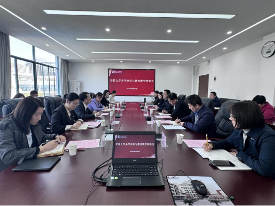 王海洋汇报了我校开放教育的整体情况,包括学校机构改革、体系建设、办学评估、学习支持服务的成效,以及开放教育与职业教育融通发展的具体举措。教务处、教学质量管理与评价中心、办学评估相关负责人分别从开放教育教学改革、质量管理、办学评估等维度汇报了工作进展、成效,下一步工作思路及意见建议。