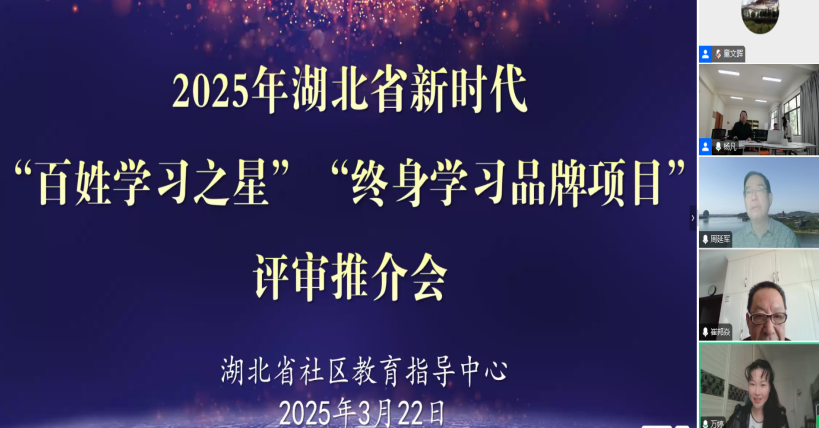 本网讯(通讯员 杨凡/文 童文晖 贾小琴/图)为进一步挖掘湖北终身学习典型,打造终身学习品牌项目,在全省范围内营造浓厚的全民终身学习氛围,3月22日,湖北省社区教育指导中心组建由中国成人教育协会、海南省教育厅、湖北省教育厅、省中心等省内外专家组成的评审组,开展2025年湖北省新时代“百姓学习之星”“终身学习品牌项目”推介工作,在市(州)初评推介基础上,对各地推荐的候选人和项目进行综合评审。社区教育学院(省中心办公室)全程组织协调,确保评审工作高效有序开展。