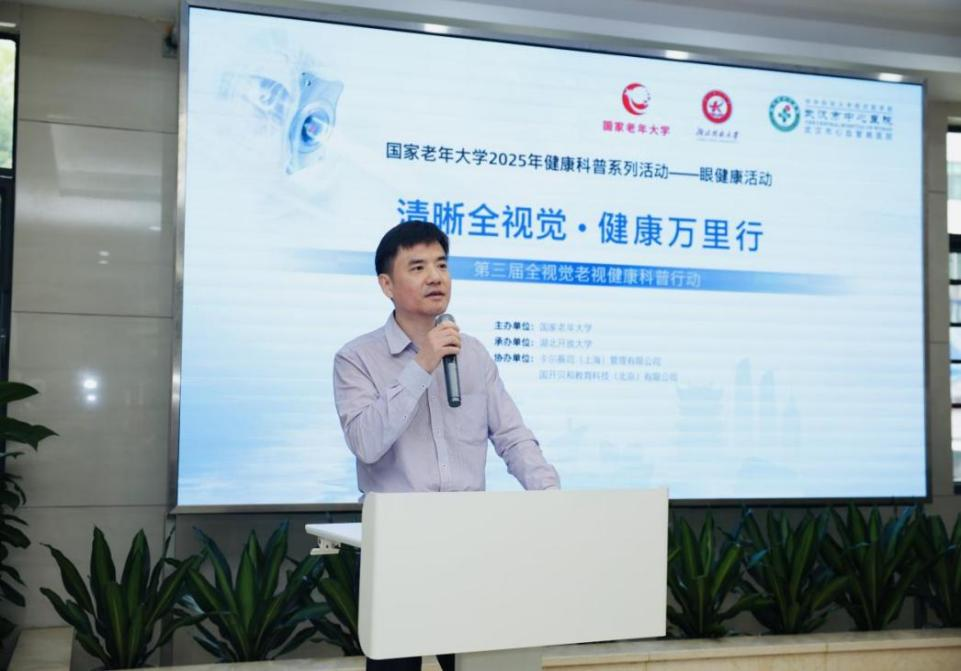 肖潇代表学校致辞,她表示,学校积极落实省委、省政府赋予的“服务湖北全民终身学习和学习型社会建设”职责,深入践行“德学康乐为”办学宗旨,将老年主动健康教育纳入老年教育服务体系,通过院校合作,为老年人健康保驾护航。湖北开放大学以“爱眼日”为契机,联合武汉市中心医院、卡尔蔡司(上海)管理有限公司等专业机构,构建“科普讲座+义诊检查+健康指导”的全方位服务平台,旨在借助专业力量破除认知误区,帮助老年人树立科学眼健康理念,更好地满足老年群体多样化、个性化学习需求。