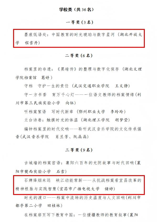 此次征文,全省共收到稿件2860篇,经评审选出学校类一等奖3名、二等奖6名、三等奖9名、优秀奖18名。我校人文管理学院、开放教育学院教师程雪丹的作品《墨痕低语处:中国教育的时光琥珀与数字星河》获学校类一等奖,宜昌电大教师储婷的作品《石牌烽烟未远峡江动能常新——从抗战档案看宜昌改革的精神根脉与实践智慧》获学校类三等奖。