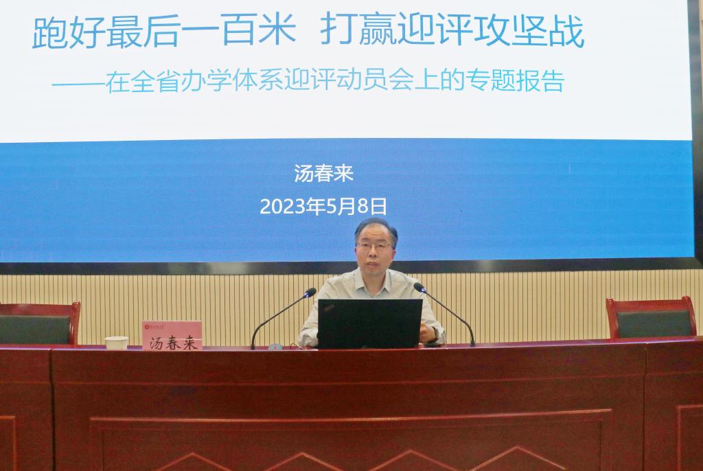 副校长汤春来作了迎评工作专题报告。他深刻解读评估性质特点、有关安排及指标内涵,全面客观总结了学校迎评促建以来体系评估、教学质量、办学条件、材料建设以及迎评氛围五个方面的成效,并就迎评工作明确了胸怀既定目标、做好知识储备、备实各种材料、落细现场环节、提高协同效率、加强校园管理、突出办学亮点、做好应急处置等“八个务必”工作要求。他强调,全省办学体系要坚持“促规范、促建设、促改革、创特色”原则,以拼的决心、抢的劲头、实的作风,跑好最后一百米,打赢迎评攻坚战。