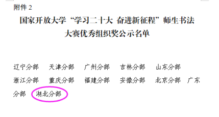 此次成绩的取得,得益于各办学单位校领导高度重视,全省体系师生踊跃参与。通过书法大赛活动,引导师生深入学习领会党的二十大精神,激发师生的爱党爱国之情,落实立德树人根本任务,弘扬中华优秀传统文化,充分展现了湖北开放教育师生的艺术风采。