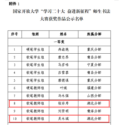 近日,国家开放大学公示比赛结果,湖北分部共18幅作品获奖,其中一等奖2项、二等奖5项、三等奖4项、优秀奖7项。获奖数全国排序第二,湖北分部获得优秀组织奖。