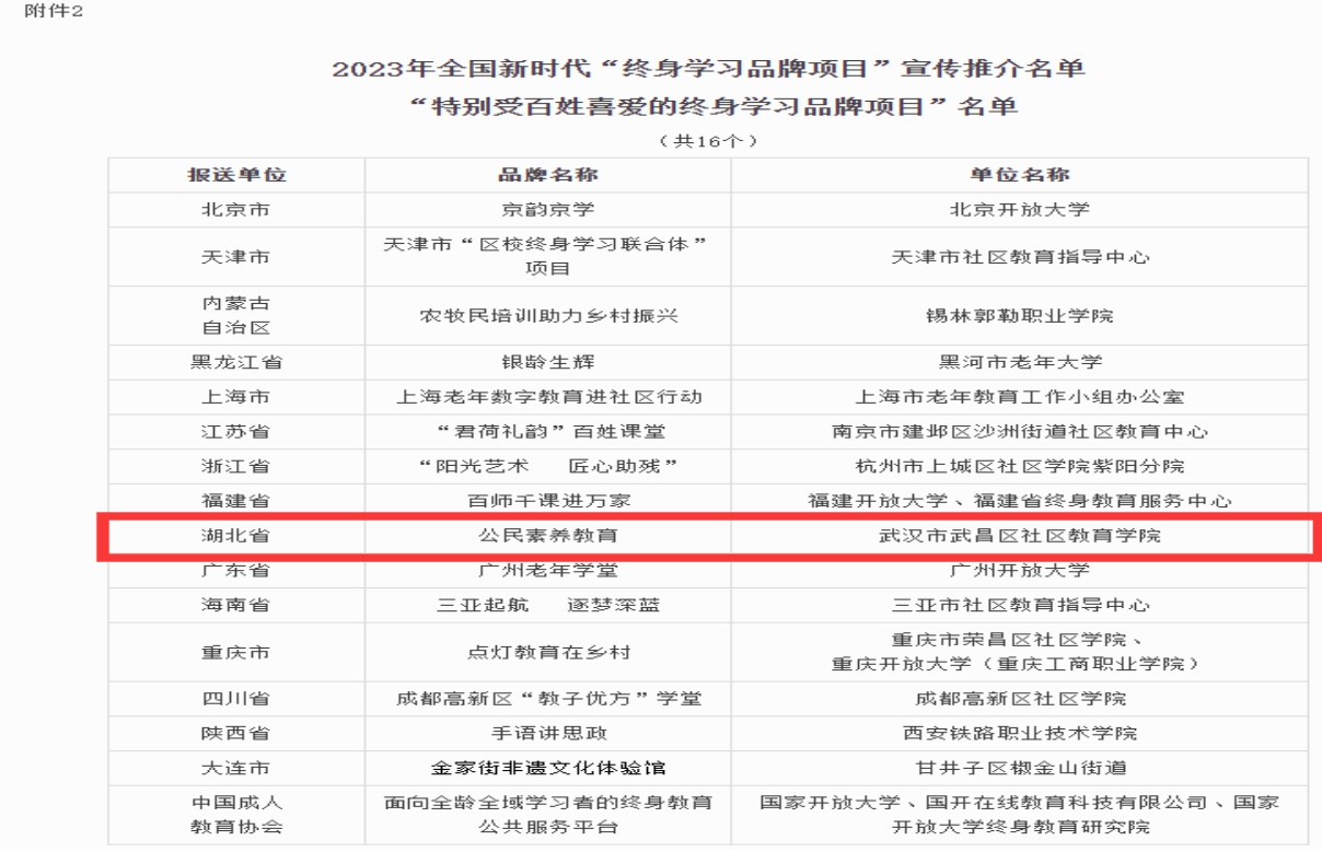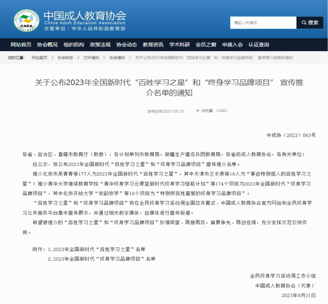 本网讯(通讯员 杨凡 文/图)经各省推荐,全国评选,广泛关注的2023年全国新时代“百姓学习之星”“终身学习品牌项目”推介名单于8月31日正式揭晓,我省满额获奖,共获得全国“百姓学习之星”“终身学习品牌项目”共10项,其中“事迹特别感人的百姓学习之星”“特别受百姓喜爱的终身学习品牌项目”各1项,“双特别”获得数并列全国第一。