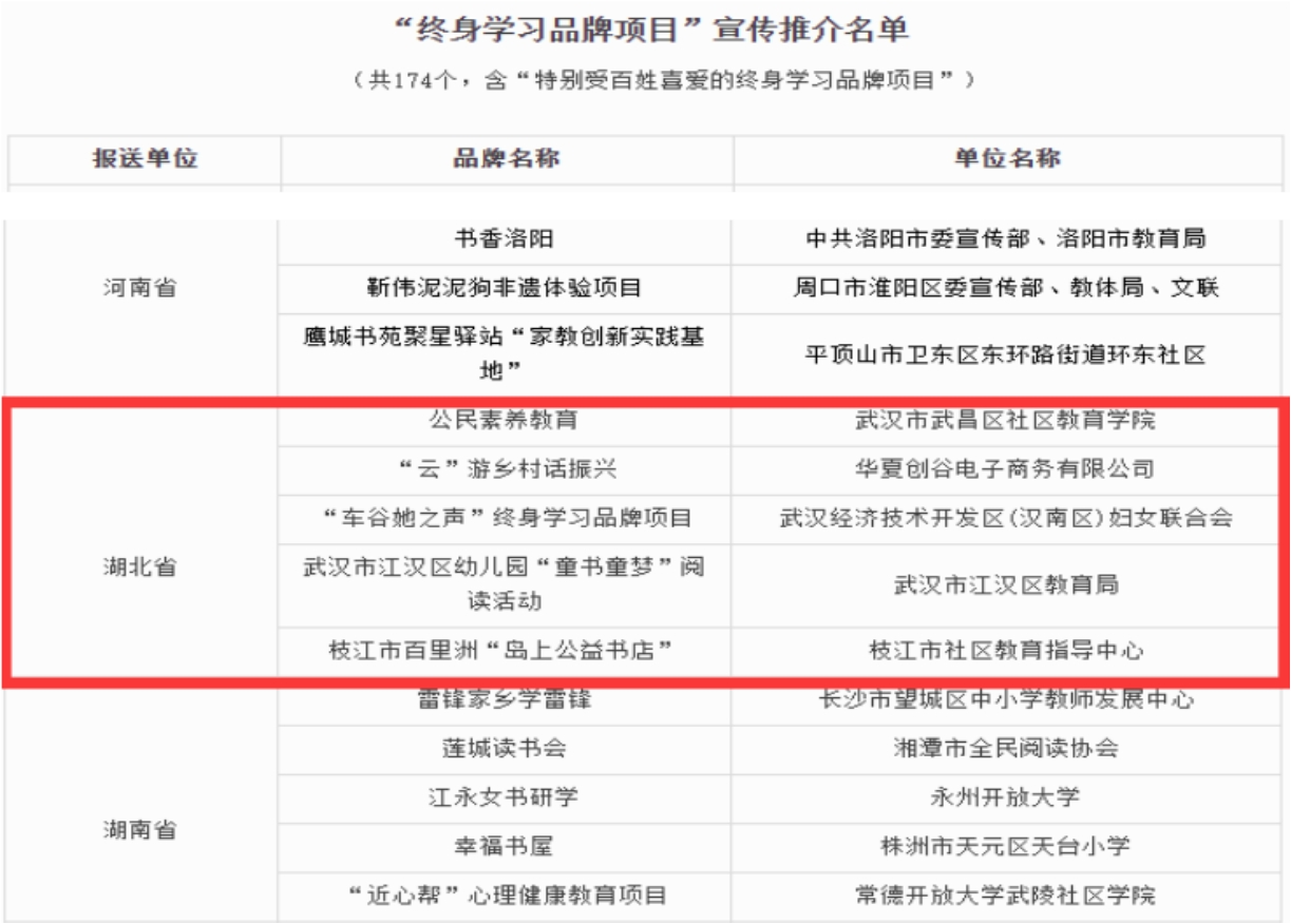 近年来,湖北省社区教育指导中心致力高质量推进全省社区教育品牌建设工作,全员全覆盖下基层开展指导服务,帮助当地挖掘、培育、打造终身学习典型人物及品牌项目。在市级遴选基础上,省中心利用假期逐一指导、润色、打磨项目,召开省级评审会,遴选推介一批富有湖北特色,有影响力、感染力、号召力的“百姓学习之星”“终身学习品牌项目”参加全国评选。