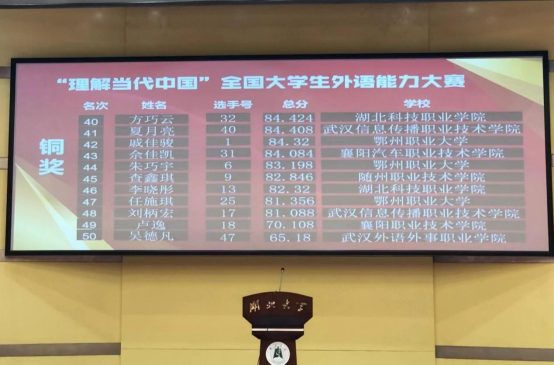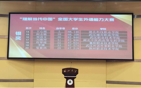 本网讯(通讯员 陈玲/文 郭蕾吟/图)10月29日,“外研社·国才杯”“理解当代中国”全国大学生外语能力大赛湖北赛区演讲比赛在湖北大学落下帷幕。本次大赛由湖北省教育厅主办,湖北大学承办,湖北省高等教育学会大学外语教学专业委员会和外语教学与研究出版社协办,全省兄弟院校共132名选手参赛。经过两轮激烈比拼,我校三名学子成功晋级决赛,并以高分段成绩分别斩获银奖一项、铜奖两项。