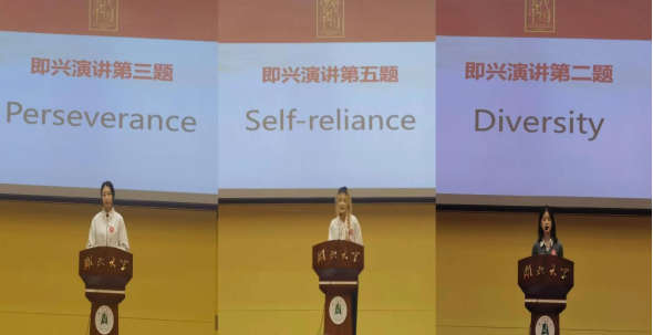 在决赛即兴演讲环节,三位同学旁征博引,从国内外时事和社会关注热点以小见大,窥见中国式现代化发展之磅礴和康庄大道,以丰富的知识储备、多元的文化视角、流畅的英语表达讲述了中国方案开创人类文明新形态、中国智慧促进世界发展新格局、中国主张实现人类命运共同体的中国故事。与众多院校的英语专业选手同台竞技,我校参赛选手富有深度的演讲风格和落落大方的自信风采赢得了评委老师和现场观众的认可和好评。