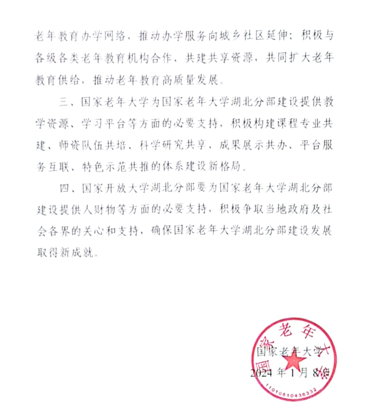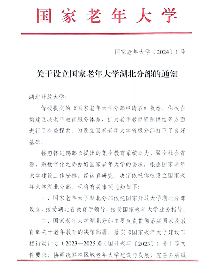 本网讯(通讯员 杨凡 文/图)近日,国家开放大学印发《关于设立国家老年大学湖北分部的通知》(国家老年大学〔2024〕1号),正式明确依托湖北开放大学设立国家老年大学湖北分部。《通知》高度肯定湖北开放大学“在构建区域老年教育服务体系、扩大老年教育资源供给等方面进行了有益探索,为设立国家老年大学省级分部打下了良好基础”。明确国家老年大学湖北分部接受湖北省教育厅领导,接受国家老年大学业务指导,主要负责贯彻落实国家及教育部关于老年教育的决策部署,《国家老年大学建设工程行动计划(2023—2025)》等文件要求,协调统筹湖北省老年教育建设与发展,完善多层级老年教育办学网络,推动办学服务向城乡社区延伸,推动湖北省老年教育高质量发展等相关职责。