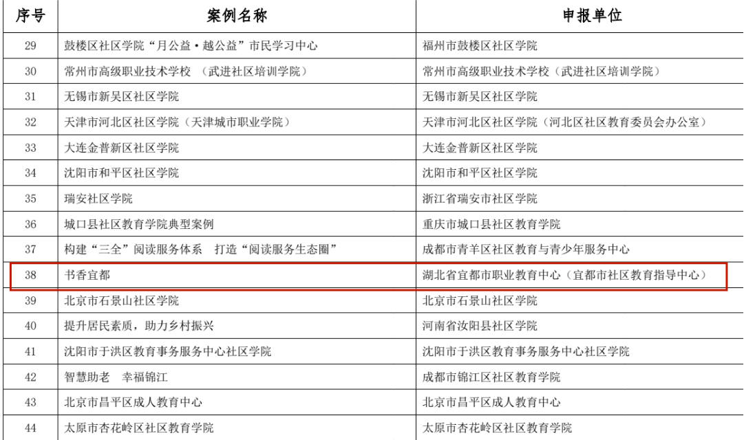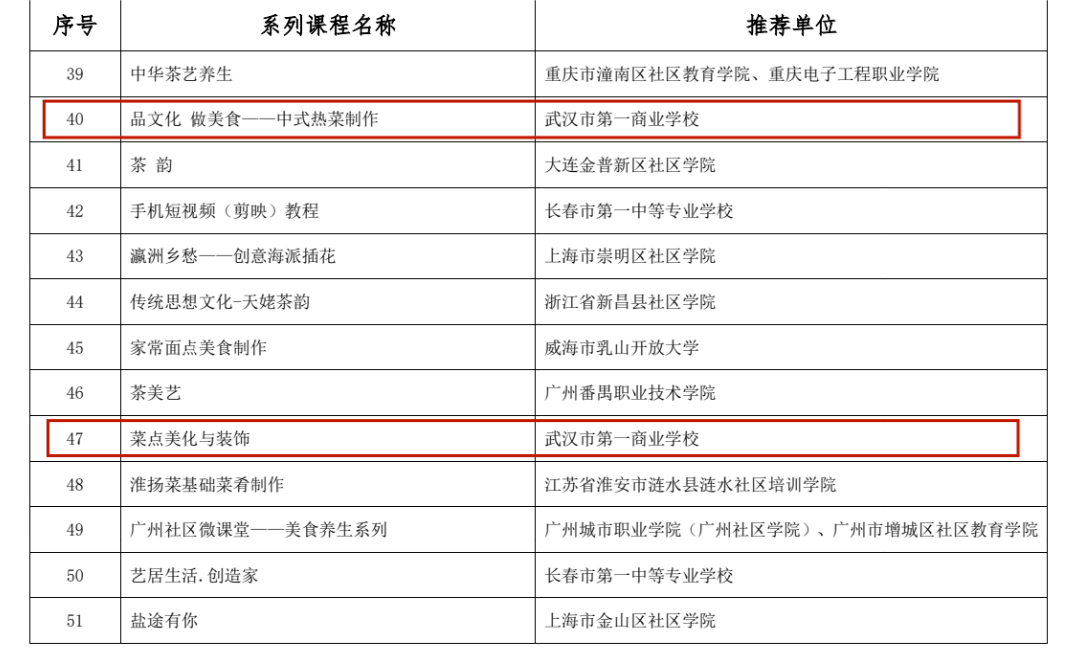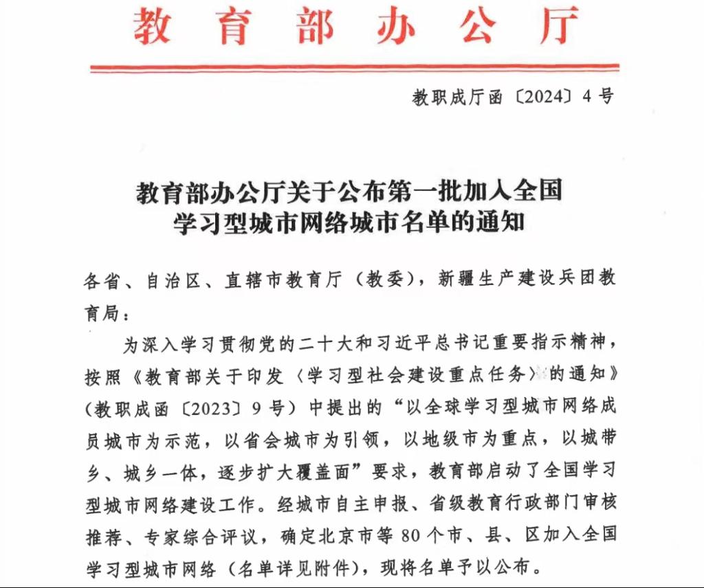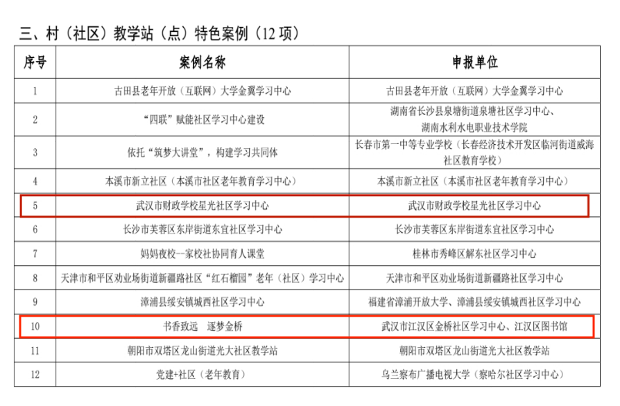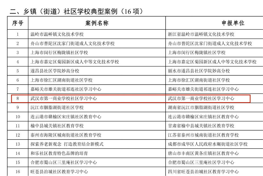 2月22日,《教育部办公厅关于公布第一批加入全国学习型城市网络城市名单的通知》(教职成厅函〔2024〕4号)公布湖北省武汉市成功入选“全国学习型城市网络”。2月26日,公布“宜都市社区教育指导中心—书香宜都”入选县(市、区)社区教育学院样板案例、“武汉市第一商业学校社区学习中心”入选乡镇(街道)社区学校典型案例、“武汉市财政学校星光社区学习中心”“武汉市江汉区金桥社区学习中心——书香致远 筑梦金桥”入选村(社区)教学站(点)特色案例。武汉市第一商业学校的“品文化 做美食—中式热菜制作”和“菜点美化与装饰”入选县域社区教育品牌课程。