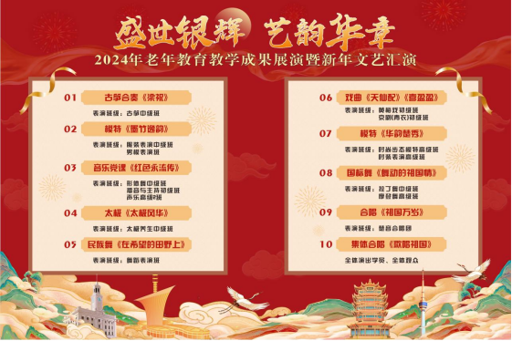 本网讯(通讯员 陈佳 刘样 文/图)今年,我校获批全国“老年大学特色建设项目实验校”,工作实践入选全国“老年教育优秀案例”。为展示老年师生乐学风采与教学质量成效,在全省体系老年教育体系发挥示范引领凝聚合力作用,12月19日下午,我校举办了“盛世银辉 艺韵华章”2024年老年教育教学成果展演暨新年文艺汇演。展演由社区教育学院承办,采取线上与现场相结合的形式。