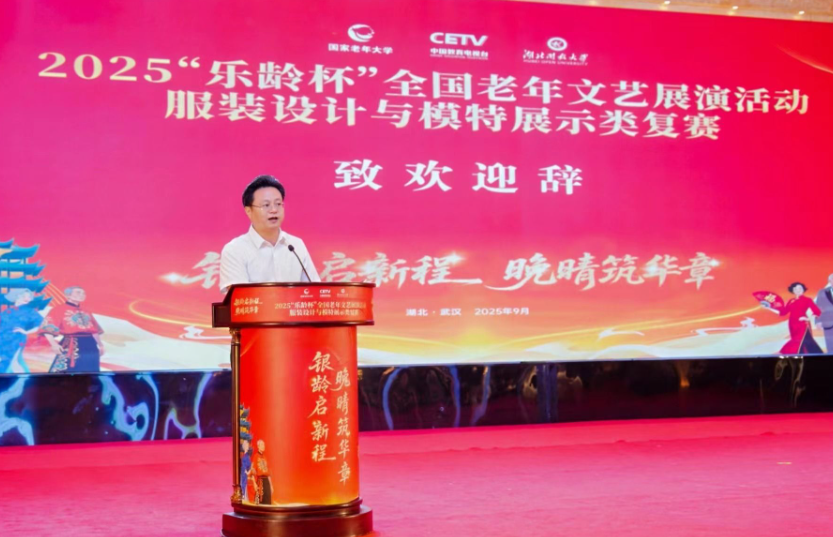 开幕式上,我校党委副书记、校长陈志祥致欢迎辞。他表示,省委、省政府赋予我校“服务全民终身学习”和“学习型社会建设”的使命任务,学校正着力构建泛在可及的终身教育体系,以实绩实效回答“开大何为”的时代之问。目前,线下已搭建覆盖省市县三级的办学体系,打造了省级老年教育示范办学“样板间”和内涵发展“试验田”;线上建设了点击量超过5000万的“湖北省社区教育网”空中课堂,提供不同类别教育资源供给,为全社会提供线上线下、分层分类的教育服务,满足全领域、全龄域、全时域的学习需求。“本次复赛突出三个‘合’:一是‘静动结合’,以静态陈列讲述纹样里的文化故事,以动态步伐展现服饰的生命力量;二是‘台景融合’,室内T台与户外山水相继联动,带大家沉浸式体验‘知音湖北,遇见无处不在’的人文意境;三是‘赛文契合’,通过赛事弘扬楚文化,搭建老年教育成果展示之窗与文化传播之桥”。陈志祥表示,将以专业的组织保障与周到的服务,提升承办的特色与温度,让来自全国的参赛选手领略荆楚神韵,绽放银龄风采,以方寸舞台演绎时代华章!