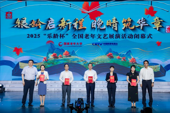 本网讯(通讯员:刘莺/文 马蓉/图)9月14日,由国家老年大学与中国教育电视台联合主办的2025“乐龄杯”全国老年文艺展演活动闭幕式在北京圆满落幕。我校受邀携获奖节目精彩亮相,在全国舞台上展现荆楚银龄的独特魅力与昂扬风采,并获评“优秀组织单位”。我校作为国家老年大学湖北分部,选送的两个节目斩获 “最佳风采节目” 称号,其指导教师也相应荣获 “最佳指导教师” 奖项。这些荣誉既是对国家老年大学湖北分部的肯定,也彰显湖北老年教育事业在高质量发展道路上稳步前行,再上新台阶。