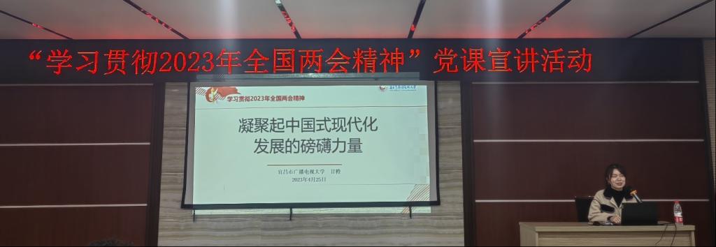 宜昌电大思政课教师甘橙,作题为《凝聚起中国式现代化发展的磅礴力量》的党课宣讲。甘橙从两会热点话题引入,深入浅出地讲解了全国两会与“中国式现代化”的内在关系,详细介绍了2023年政府工作报告的相关内容。她带领全体人员深刻领会了中国式现代化的本质特征,表明中国式现代化是人口规模巨大的现代化、是全体人民共同富裕的现代化、是物质文明和精神文明相协调的现代化、是人与自然和谐共生的现代化、是走和平发展道路的现代化。