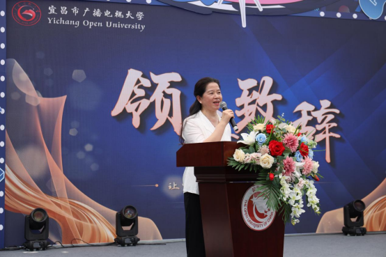 宜昌市广播电视大学党委书记、校长王桃致辞。她对与会的各级领导、嘉宾、社区达人及工作者表示热烈的欢迎和诚挚的敬意。她表示,本次活动是学习贯彻党的二十大关于教育数字化与终身学习社会的具体实践,展示了宜昌电大在社区教育网络建设、资源开发及品牌推广方面的成就,促进了社区教育的繁荣。社区达人秀不仅是一场才艺展示,更是对“宜学之城”理念的生动实践,体现了宜昌对文化多样性和创新的尊重。未来,宜昌市广播电视大学将深化开放共享合作,利用数字化资源推动终身学习,激发社区文化活力,为建设学习型社会和教育强市作出贡献。
