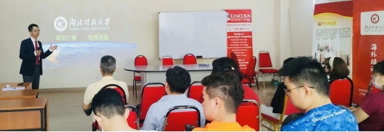 教育推介与专业培训由林肯大学学院副校长KelvinTong博士主持,我校田野博士以《开放的世界,与开大同行》为题,对湖北开放大学进行了专题推介,重点介绍了学校的办学理念以及软件技术、机电工程和人工智能等特色专业(群)建设情况,并基于学校传统的工科强项专业,以《如何用人工智能提升企业竞争力》为主题,为学生提供了针对性的培训课程。