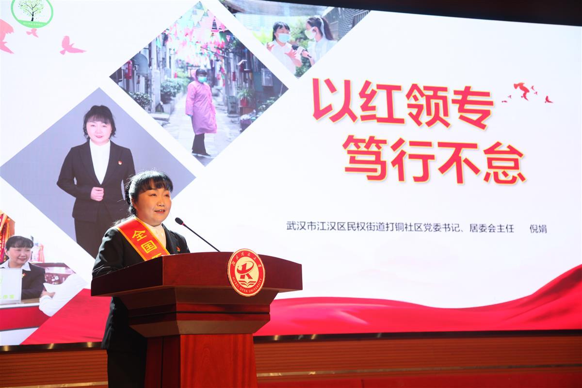 全国五一巾帼标兵,全国妇联“城乡社区抗疫巾帼先锋”,武汉市江汉区民权街道打铜社区书记倪娟,是疫情期间著名的“逆行”书记”。扎根社区十五年,孵化培育社会组织,探索数字赋能道路,将“敬业、精益、专注、创新”的工匠精神发挥到极致,打造出老旧社区治理示范样板。她以《以红领专 笃行不怠》为主题,为宣讲学生传递了坚持党建引领,坚守为民初心的红色力量。