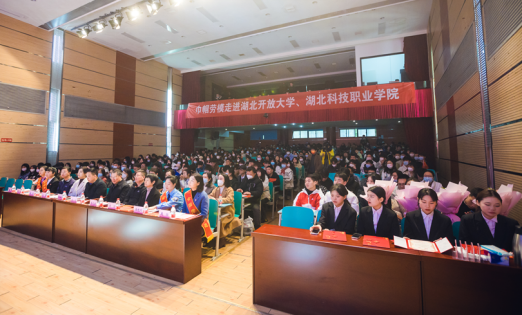 神州自古赞巾帼,美誉娥眉响颂歌。3月21日,以“奋进新征程 巾帼绽芳华”为主题的巾帼劳模进校园宣讲活动在湖北开放大学(湖北科技职业学院)举行。湖北开放大学(湖北科技职业学院)党委书记刘义、党委常委张化斌,湖北省总工会党组成员、副主席刘建宇等出席活动并分别致辞。此次活动邀请了全国五一劳动奖章获得者王艳鸽,党的二十大代表、全国劳动模范周怡,党的二十大代表、全国劳动模范姚婕,全国五一巾帼标兵、全国“城乡社区抗疫巾帼先锋” 倪娟四位巾帼劳模走进校园,以“文艺+宣讲”的形式,为当代大学生上了一节别开生面的“大思政课”。