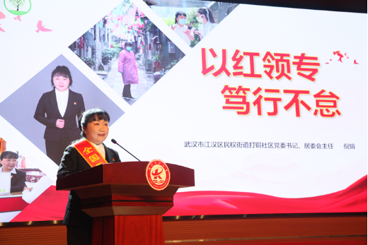 扎根基层立鸿鹄志,挥洒汗水做奋斗者,来自武汉市江汉区民权街道打铜社区的党委书记、全国五一巾帼标兵,全国“城乡社区抗疫巾帼先锋” 倪娟,扎根社区十五年,孵化培育社会组织,探索数字赋能道路,将“敬业、精益、专注、创新”的工匠精神发挥到极致,打造出老旧社区治理示范样板。她以《以红领专 笃行不怠》为主题,为宣讲学生传递了坚持党建引领,坚守为民初心的红色力量。