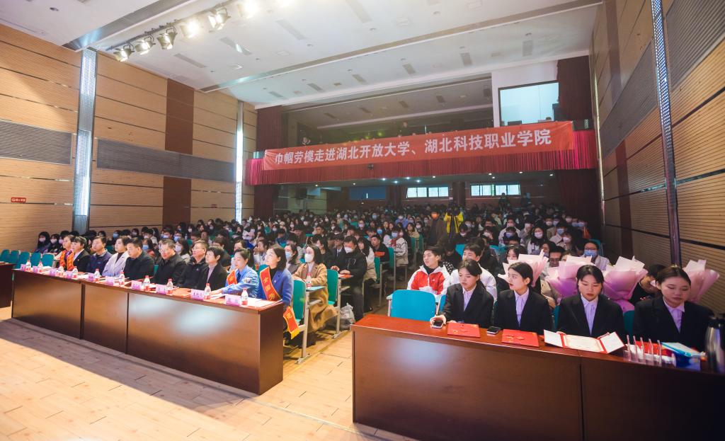 3月21日,以“奋进新征程 巾帼绽芳华”为主题的巾帼劳模进校园宣讲活动在湖北开放大学举行。湖北开放大学党委书记刘义、党委常委张化斌,省总工会党组成员、副主席刘建宇等出席活动并分别致辞。活动邀请了全国五一劳动奖章获得者王艳鸽,党的二十大代表、全国劳动模范周怡,党的二十大代表、全国劳动模范姚婕,全国五一巾帼标兵、全国“城乡社区抗疫巾帼先锋” 倪娟四位巾帼劳模走进校园,以“文艺+宣讲”的形式,为当代大学生上了一节别开生面的“大思政课”。