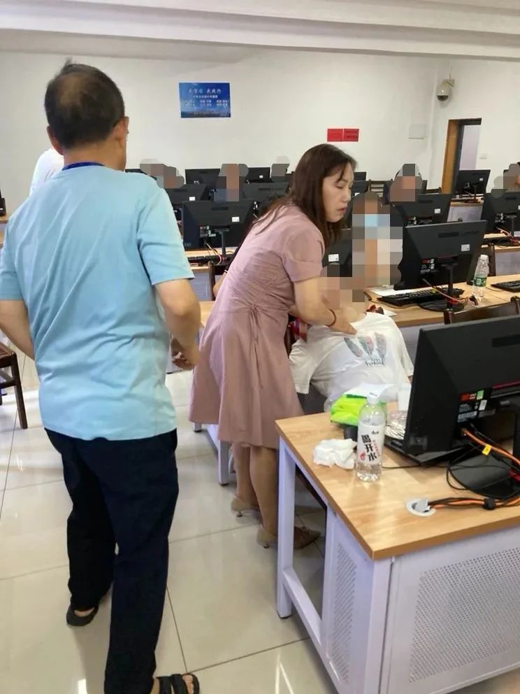 期间,计算机1室一考生突发不适,脸色惨白、直冒虚汗、手脚发凉,伴随身体间断性颤抖,监考教师王海文、贾雨、陈天蓉立即上前查看该考生的身体状况,询问该考生是否感到身体不适,同时安抚考场其他考生。此时该考生意识模糊、无法回答,监考老师当机立断拨打了120急救电话,为其提供靠垫、纸巾和饮用水,并将这一突发情况及时向学校主要领导汇报。