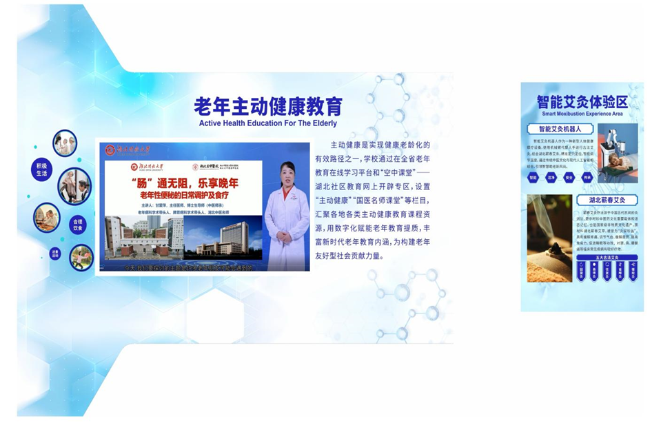 打造AI赋能主动健康、引领智慧养老新风尚场景建设。以智慧老年教育主动健康“小切口”展示老年教育“大作为”,对接湖北省中医院及联合科技公司,开发建设AI数字人主动健康课程资源,将主动健康教育以数智形式传播,联动助力老年人健康教育服务。通过老年教育在促进老年人主动健康方面的引导作用,不断提升老年教育服务能力,丰富新时代老年教育内涵,推动数字化信息技术赋能老年教育高质量发展。