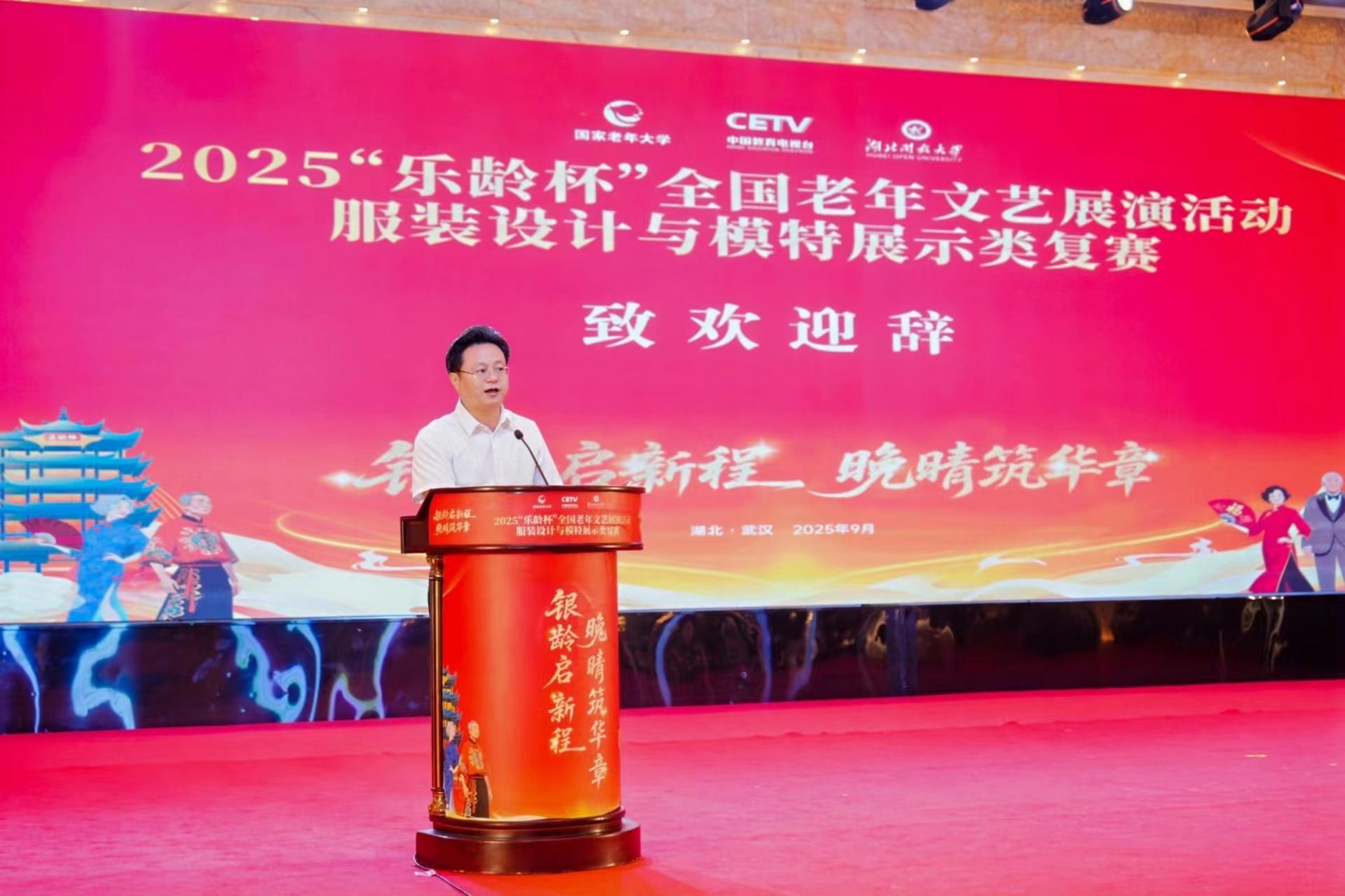 湖北开放大学党委副书记、校长陈志祥致辞:在这美好时刻,我们齐聚江城武汉,共同迎来2025“乐龄杯”全国老年文艺展演——“服装设计与模特展示类”复赛的隆重启幕。我谨代表湖北开放大学,向长期关心和支持学校发展的各位领导致以崇高敬意!向怀揣热爱、远道而来的参赛选手表示热烈欢迎!向各支持单位、评委团队以及媒体朋友表示衷心感谢!