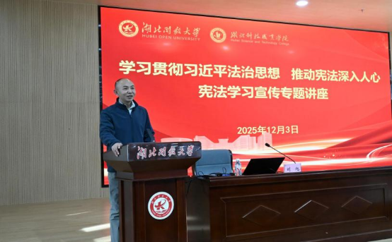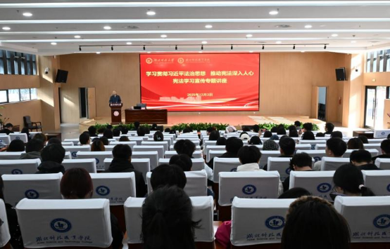 12月3日下午,在第十二个国家宪法日来临之际,湖北开放大学综合实训楼学术报告厅内座无虚席——由湖北开放大学校党委宣传部主办、湖北科技职业学院机电工程学院承办的专题法治讲座在此开讲。