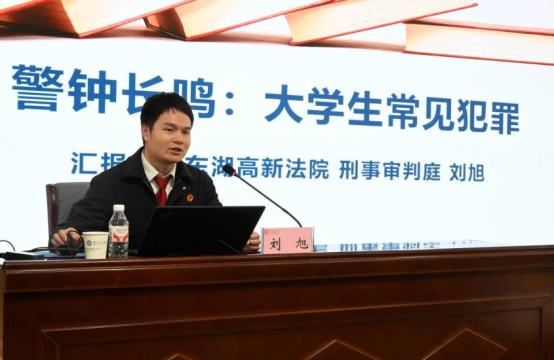 武汉市东湖新技术开发区人民法院法官助理刘旭带来的“案例式”普法,让在场师生直呼“听得懂、用得上”。“宪法从不是挂在墙上的条文,而是管日常的‘硬规矩’。”刘旭以“警钟长鸣:大学生常见犯罪”为题,避开空洞说教,用11个真实案例“现身说法”。从帮同学代考触犯刑法,到利用技术漏洞盗取信息发送骚扰短信的网络犯罪,再到宿舍冲突升级为寻衅滋事,这些涵盖考试作弊、网络诈骗、危险驾驶等10类高频风险的案例,把法律红线具象化为可感知的校园场景。